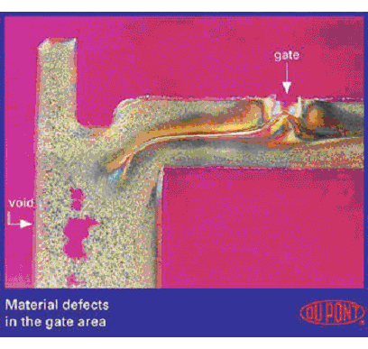 由于含有纖維增強(qiáng)材料,熔合線區(qū)域的纖維的排列方向與流動(dòng)方向垂直。這將明顯降低部件在這一點(diǎn)的機(jī)械性能(見圖6)。