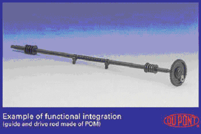 圖3中,牽引棒、彈簧、鋸齒、卡扣和軸承都為一次注射成型。而同樣的金屬設(shè)計(jì)則需要不少于5個(gè)獨(dú)立元件來組裝,并且當(dāng)軸桿與活塞連接時(shí),還需要潤滑。實(shí)際上,在這一環(huán)節(jié)使用聚甲醛樹脂便可以不用另加潤滑劑。