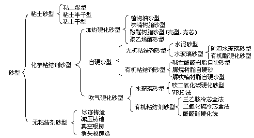 鑄造主要工藝過程包括:金屬熔煉、模型制造、澆注凝固和脫模清理等。鑄造用的主要材料是鑄鋼、鑄鐵、鑄造有色合金(銅、鋁、鋅、鉛等)等。鑄造方法常用的是砂型鑄造,其次是特種鑄造方法,如:金屬型鑄造、熔模鑄造、石膏型鑄造......等。而砂型鑄造又可以分為粘土砂型、有機粘結劑砂型、樹脂自硬砂型、消失模等等,如下圖: